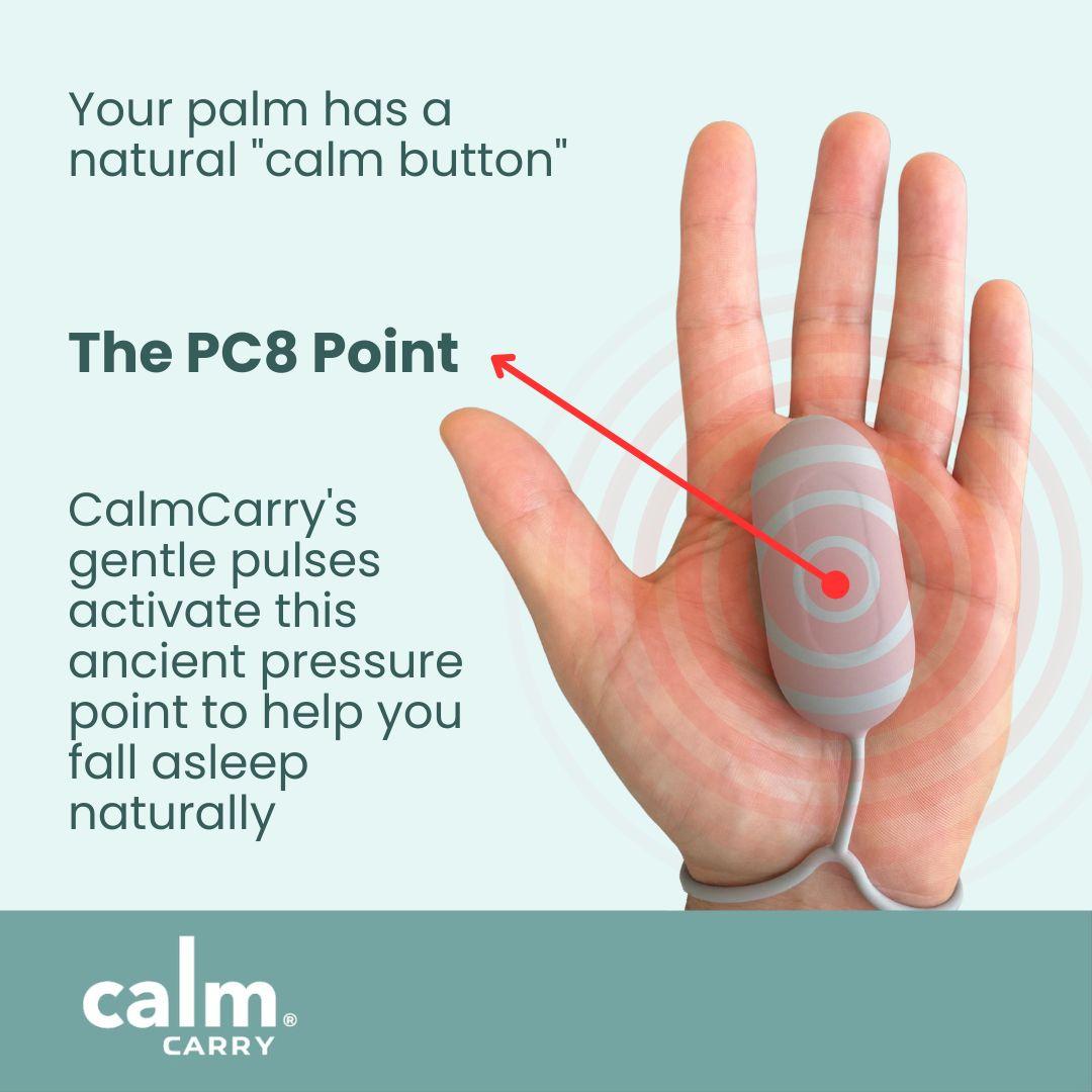 CalmCarry works by delivering gentle microcurrent pulses to a specific acupressure point in your hand. The key spot it targets is known as the PC8 point, located in the center of your palm. You can find your PC8 point by making a light fist – the point where your middle fingertip touches your palm is the spot.